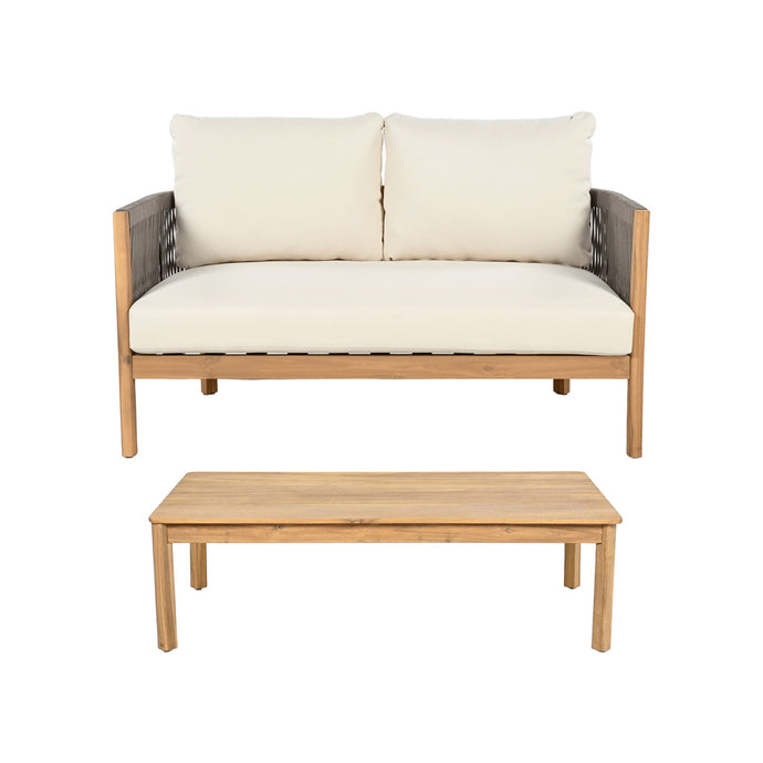 2 Piece Outdoor Acacia Wood Conversation Set, Woven Rope Backrest Patio Seating Group, Woven Rope With Coffee Table For Porch - Light Teak / Beige