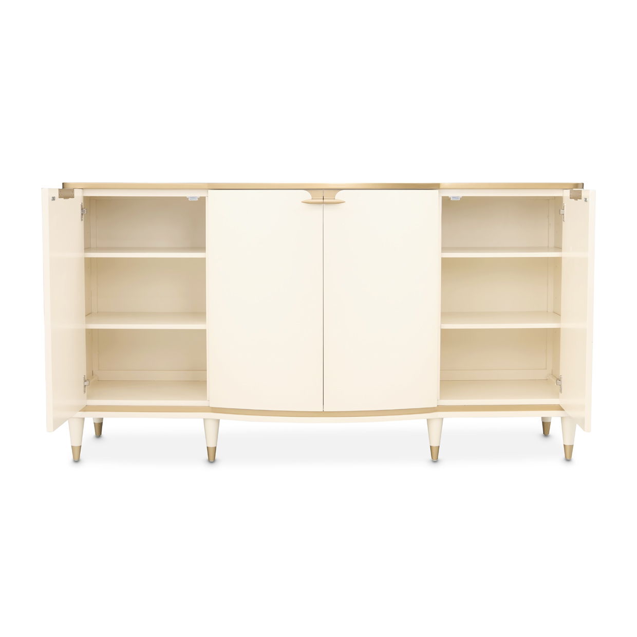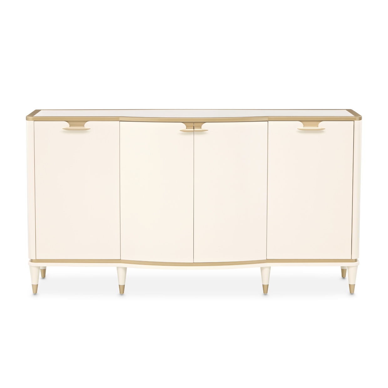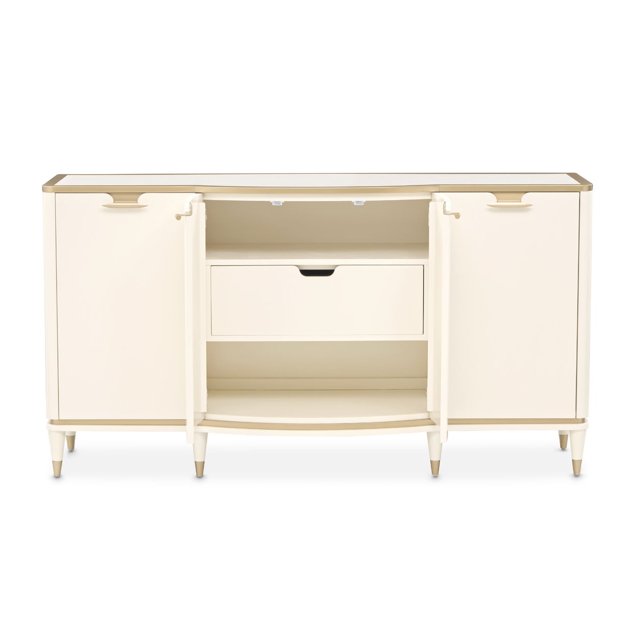 Elegant and effortlessly functional, the La Terrazza Sideboard is a masterful blend of form, finish, and fine detailing. Cloaked in a creamy pearl hue with radiant gold trim, its softly curved silhouette evokes fluidity and grace. A luxurious cultured marble top crowns the piece with polish and poise, offering a gleaming surface for elegant décor or stylish entertaining. Behind four doors, generous storage awaits: side cabinets reveal adjustable shelving tailored to your needs, while the center doors open to a hidden velvet-lined drawer—perfectly suited for fine silverware—nestled between two spacious compartments. Whether used for curated display or sophisticated storage, this sideboard is a stunning expression of luxury living.