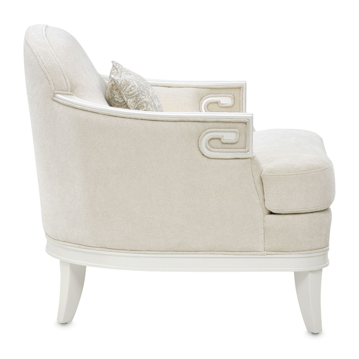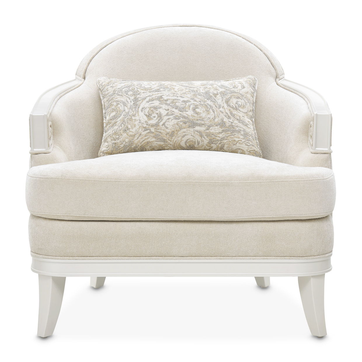 Designed to bring elegance into any space, the La Marisia Accent Chair is a statement of refined beauty. Its plush chenille upholstery in a soft hue creates a welcoming embrace, while delicate welting accentuates its curved silhouette. The scalloped backrest adds an architectural element, blending classic inspiration with modern sophistication. The arms feature a Greek Key-inspired scroll motif, a subtle nod to timeless artistry. Finished in a luminous pearl tone, the frame enhances the chair’s sculptural presence. A feather-filled accent pillow in a richly woven jacquard fabric completes the look, ensuring this piece is as inviting as it is beautiful.