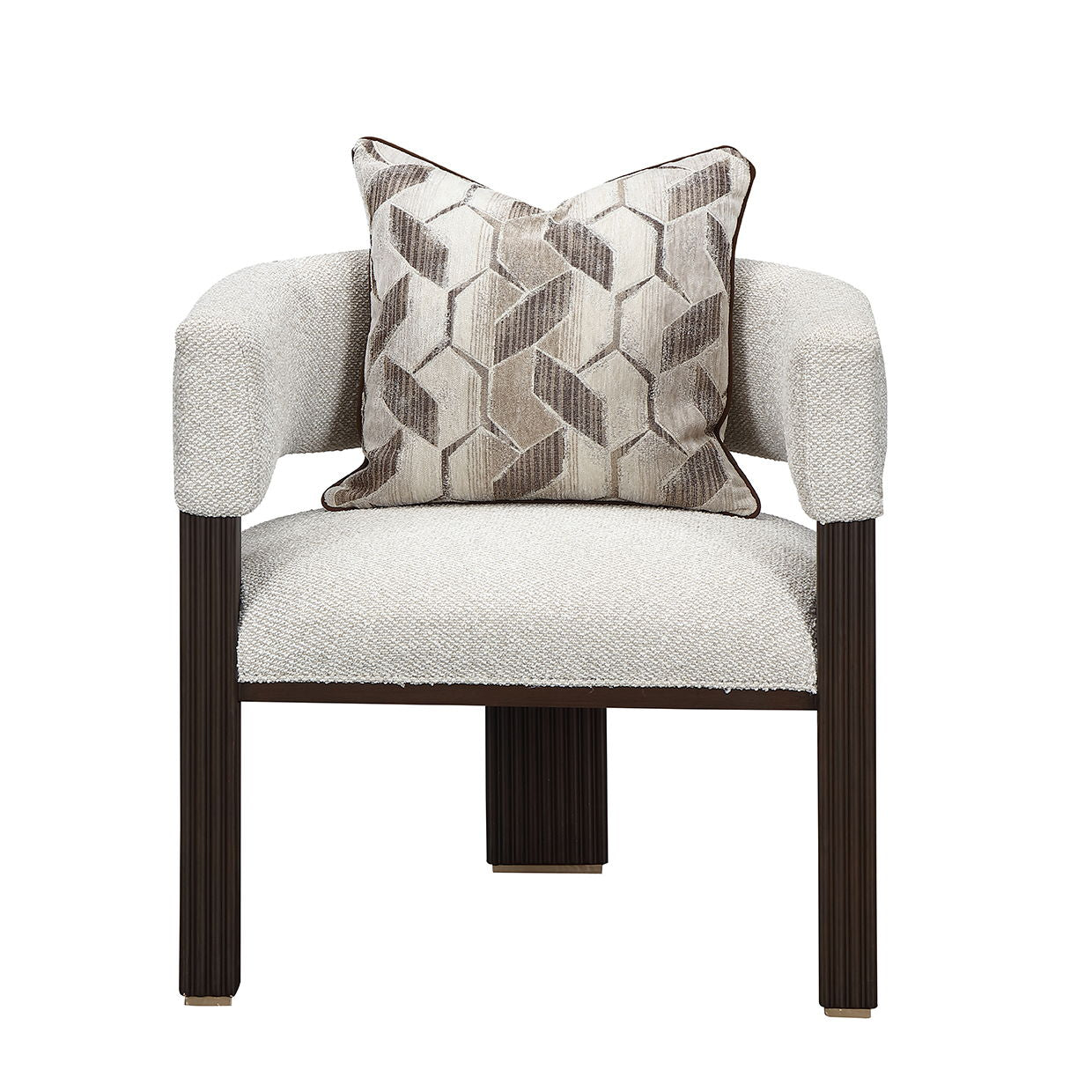 Sculptural and sophisticated, the West Kensington Accent Chair is a striking fusion of modern design and timeless luxury. Wrapped in a plush chunky woven fabric with multi-hued yarn, its soft texture complements the bold, architectural silhouette. Espresso-finished reeded legs lend a sense of depth and refinement, while gleaming gold trim adds a hint of understated glamour. A feather-filled chenille jacquard pillow enhances the chair’s tailored elegance, making it the perfect statement piece for any refined space.