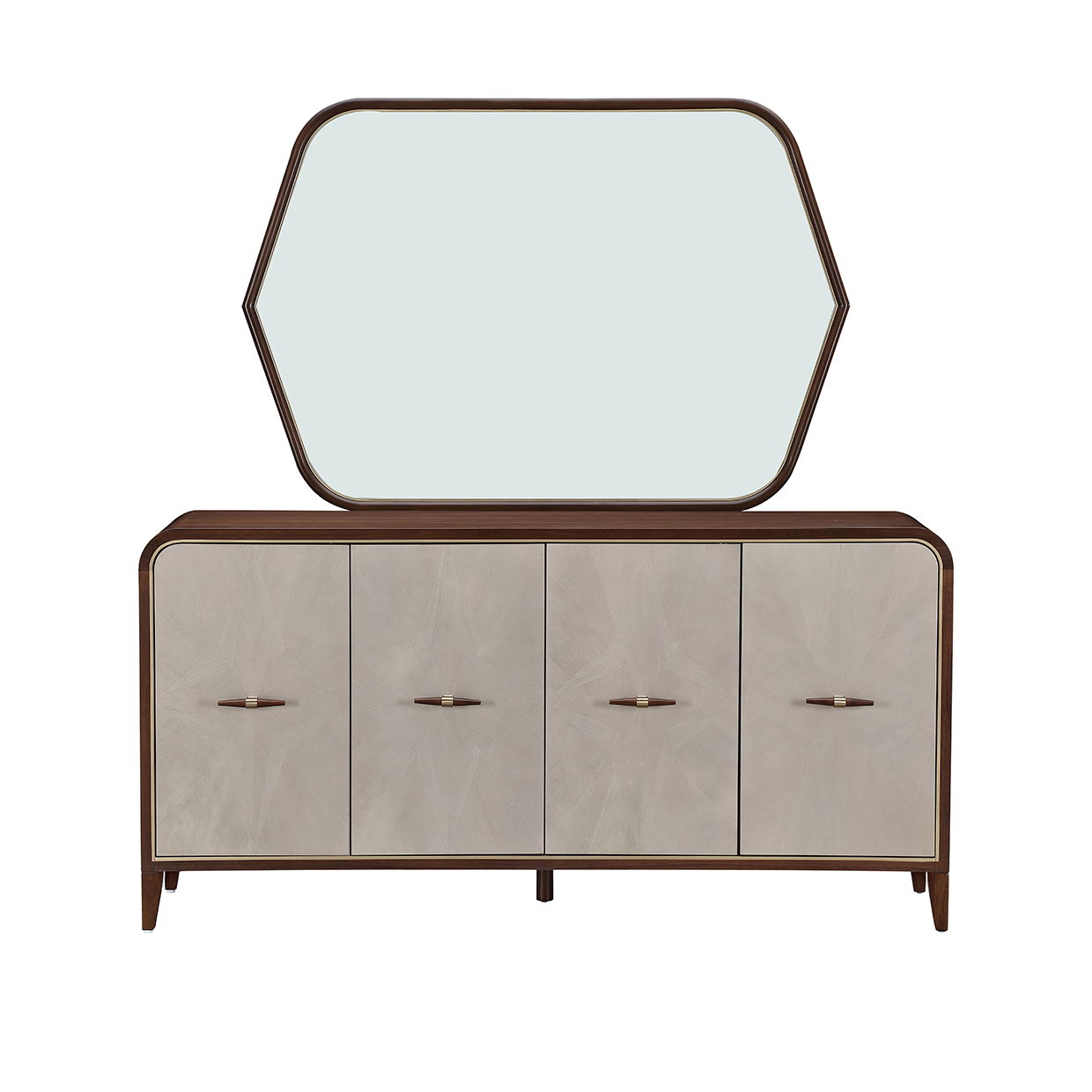 The Houston Sideboard blends contemporary elegance with versatile storage. Framed in a rich walnut finish, its contrasting door fronts showcase a delicate starburst pattern with a subtly textured surface. A refined gold trim outlines the piece, enhancing its sophisticated silhouette. The sleek, tapered handles combine wood and metal for a modern, tailored touch. With ample storage and thoughtful details, this sideboard brings both function and style to any dining or living space.