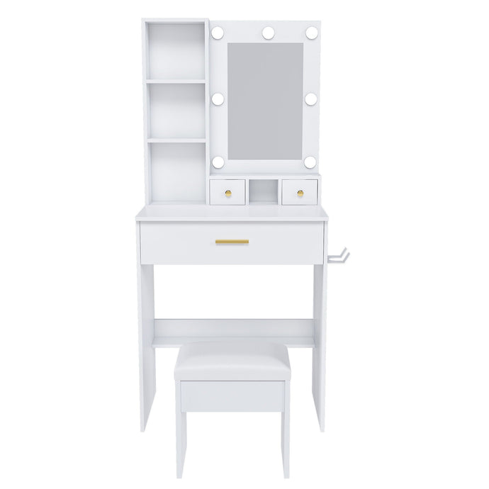 Vanity Table With Mirror, Adjustable LED Lights, Power Outlet, Hairdryer Holder & Stool