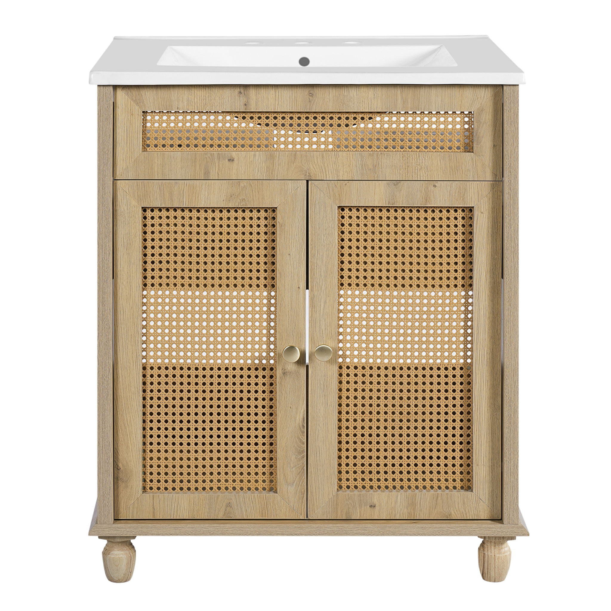 Bathroom Vanity With Handwoven Rattan Doors, Resin Basin - Natural Wood