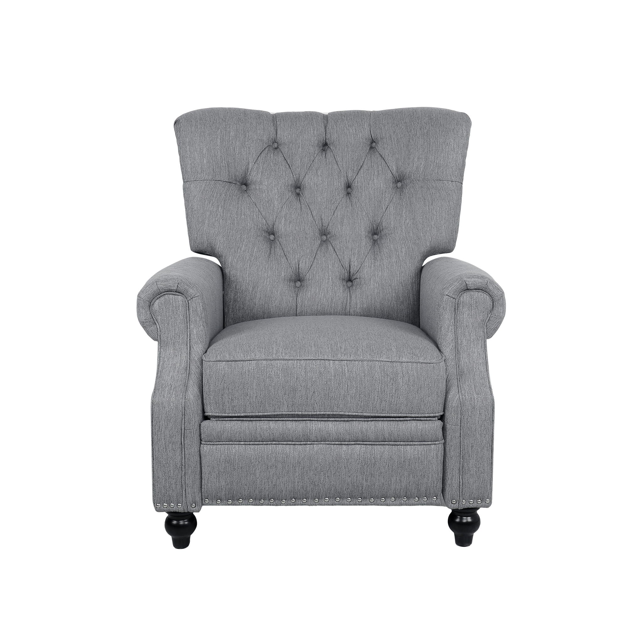 - Contemporary Design: This recliner blends modern elegance with deep button tufting, rolled armrests, turned legs, and sleek nailhead trim for a refined look.