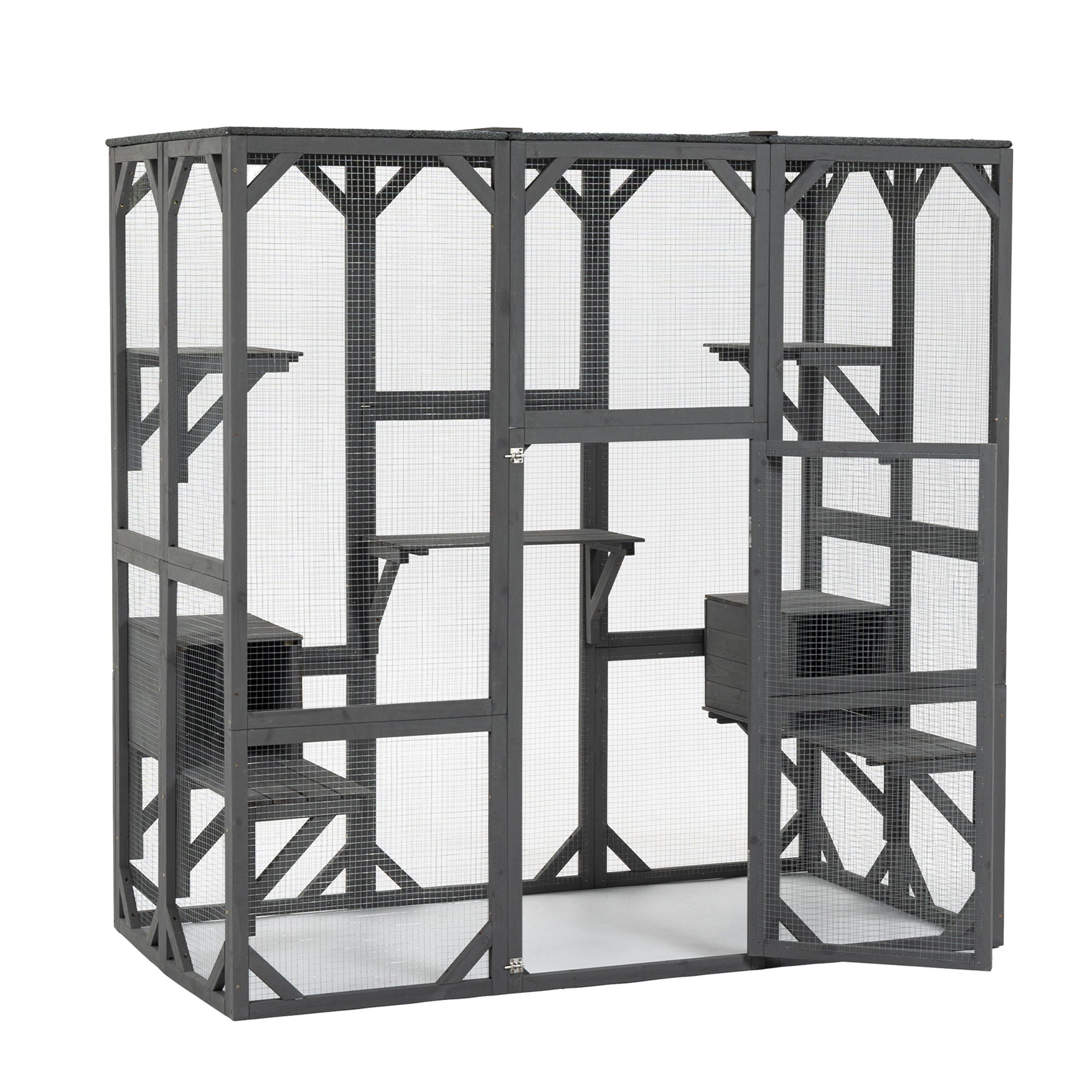 Outdoor Cat House Wooden Catio Enclosure With Cover - Large Cat Cage With Jump Platforms And Condos, Weatherproof - Gray