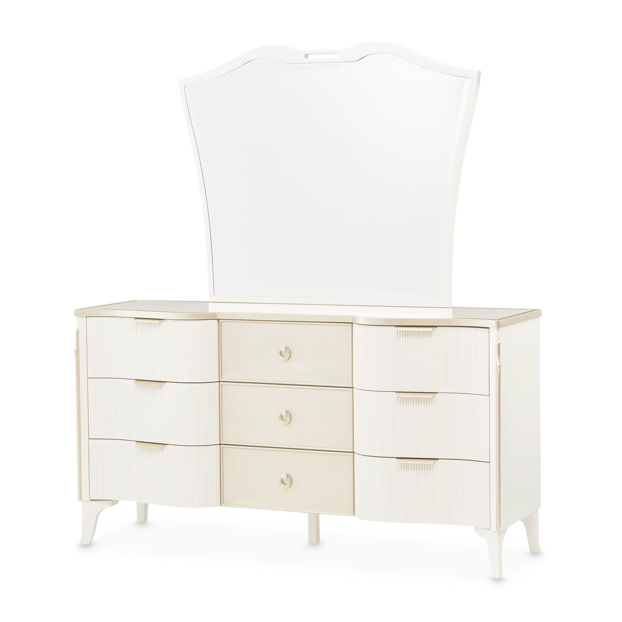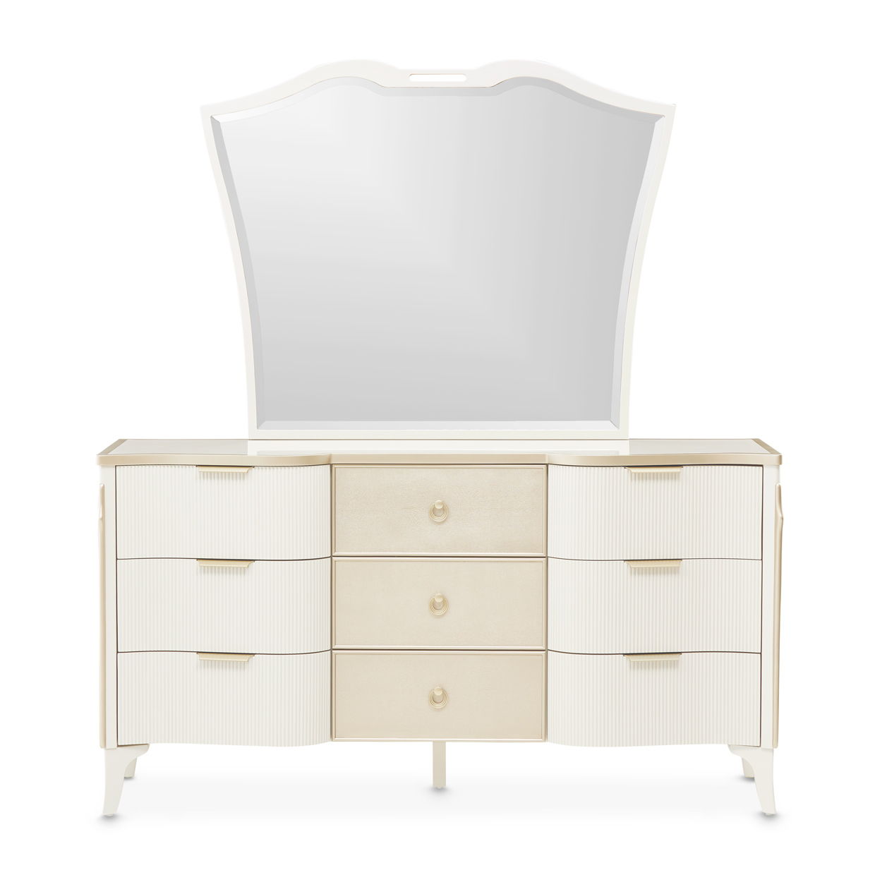 An exquisite blend of elegance and functionality, the La Marisia Dresser brings refined luxury to any bedroom. The pearl finish and champagne accents highlight its gracefully shaped silhouette, while the cultured marble top adds a polished touch. Textural details like ribbed side panels and faux-shagreen drawer fronts create a sophisticated contrast. With nine velvet-lined, soft-close drawers, this piece offers ample storage for wardrobe essentials. The coordinating mirror, framed in a soft cream hue with a beveled edge, enhances the dresser’s grandeur.