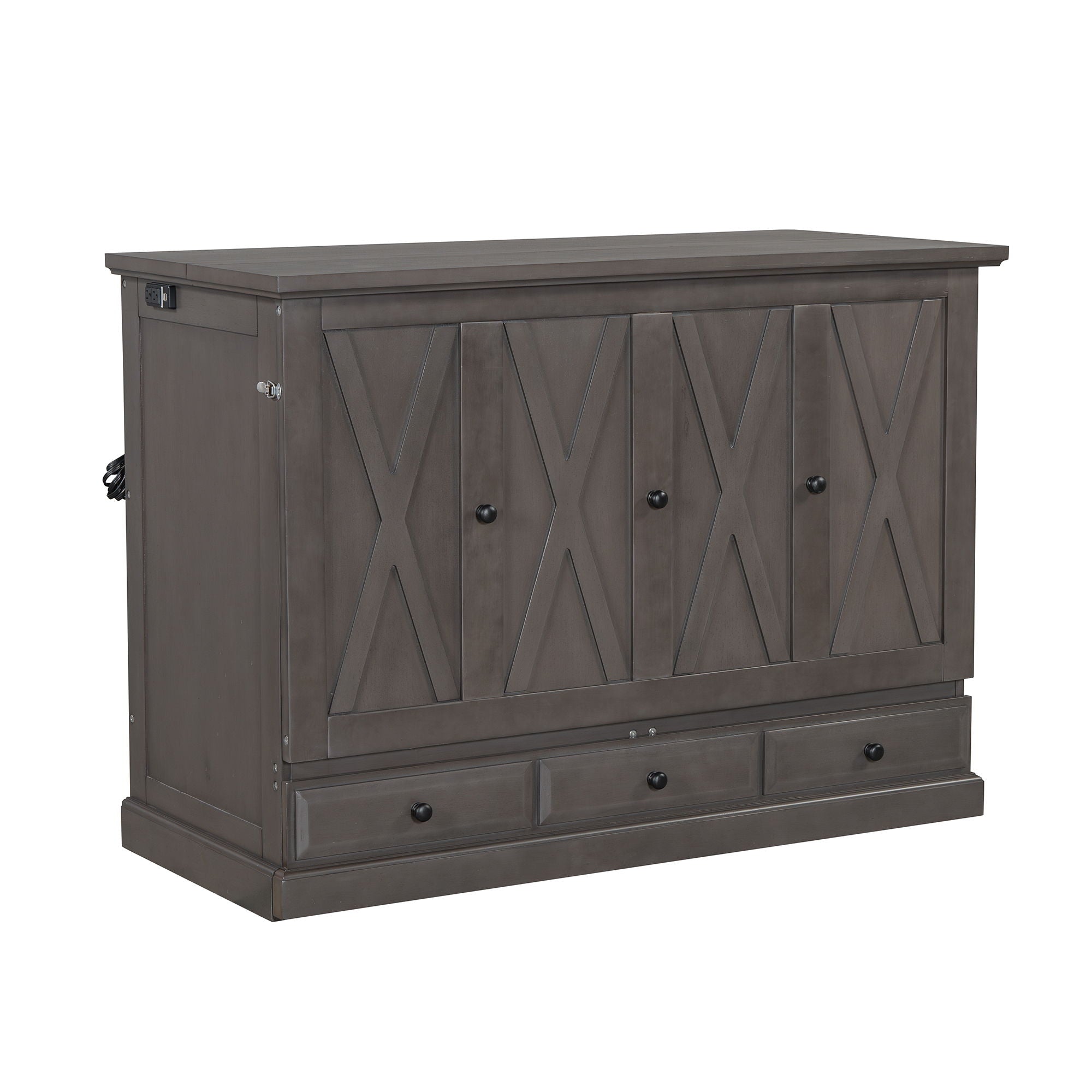 Full Solid Pine Murphy Bed Chest Cube Cabinet Bed With Charging Station And Large Storage Drawer For Home Office Or Small Room - Gray