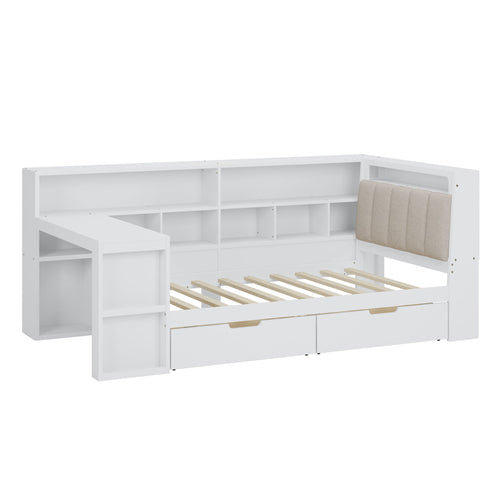 L-Shaped Daybed Corner Bed Under Bed Drawers With Storage Bookcase And Upholstered Headboard And USB Charging Ports